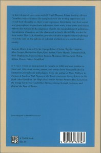 There are moments of optimism, though. Wayde Compton, one of the youngest writers interviewed, joins his elders in voicing concern for the future of Black writing in Canada, but he also describes his profound sympathy for the British Columbia-based Black writers of the ’seventies “who self-published” and were overlooked because, in that particular time and place, “there [were] no readerships and reviews.” Recently, Compton co-founded Commodore Books, a small (if not micro) press dedicated to publishing Black Canadian literature—proving, of course, that there is now at least one active Black-focused press in English Canada. Evidently, things are still happening; and Thomas’ interviews do a lot to suggest why.