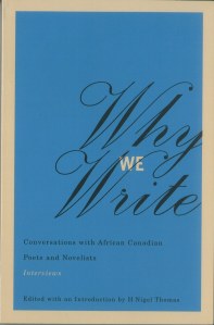 | I remember my first year of high school in Toronto, when I met a young man on the subway who was collecting donations for an all-black bookstore. He had a comprehensive list of authors that were underrepresented by corporate bookstores, a list divided into African American and African Canadian writers.I recognized half of the Americans and I was shocked to realize that I only vaguely recognized some of the Canadians. The young man was, incidentally, a crook. The black bookstore was a scam. This young man was exploiting a need in Toronto, the need for an all-black bookstore and a need for the exposure of African Canadian writers. He made a profit on the average person’s guilt over their own complicity in these matters.Nigel H. Thomas reminds me that these issues (over a decade later) are still, in fact, relevant. Canada still has a need for bookstores that market black writers, publishers still need to seek out new and marginalized talents, and African Canadian authors are still prolific forces in literature, despite the hardships and impasses that go along with being different in an audience eoriented market.Thomas’ Why We Write: Conversations with African Canadian Poets and Novelists is an edited collection of interviews with prodigious contemporary black writers. The book considers issues that are particular to African Canadian authors, such as ethnic labelling and the stigmatization of minority voices in the Canadian publishing industry, alongside matters of importance to writers of any denomination, like the function of writing itself or the need for reviews. Thomas presents fifteen talented writers, who range from the established and foundational authors like Austin Clarke to the younger and more experimental works of those like Wayde Compton, in his search for the “African Canadian literary aesthetic.” In reflecting the work of this book in his “Introduction,” Thomas says that “reading the corpus of the writers whose opinions are expressed in these conversations and the corpus of many whose opinions are not, I think I have a clearer notion of what could be called an African Canadian aesthetic” (x). However, Thomas warns us that essentializing the works of African Canadians is not the agenda of this collection. Rather than define an “African Canadian aesthetic,” Thomas would posit “an ethos that readers encounter in the works of Black Canadian writer” (xi). This “ethos” relies on considerations of identity, an identity rooted in resistance of essentialism and stereotyping. Thomas reminds his audience that the “preoccupations” of African Canadians “are the preoccupations of humanity everywhere; and how we employ words comes down to individual talent, preferences, and temperament. At this level we are like writers everywhere” (xi). In this way, African Canadian writers become part of the larger literary machine, like all aspects of writing (genre, form, style, etc.), the need for a disparity of voices from different backgrounds is essentially what defines the Canadian Aesthetic, and these conversations take their place within that framework as necessary and relevant parts of a national writing community.From the title of his book onwards, Nigel H. Thomas is concerned with issues of labelling and identity. By calling the authors interviewed “African Canadian” (without the hyphen!) Thomas has made a conscious choice to parallel the heritage of his subjects (African with Canada) as he draws a direct relationship to our neighbours in the south (African Canadian immediately links to the labelling of “African Americans” in the USA). However, not all of the writers that were interviewed agree with the label: “Ayanna Black, Lawrence Hill, and Bernadette Dyer […] expressed discomfort with the label African Canadian” (xiv). In her interview, poet and novelist Suzette Mayr says: “I think of myself more in terms of Caribbean Canadian because African Canadian seems so far away, not that I’m not part of the African Diaspora” (173). Thomas asks Wayde Compton, an experimental poet, about his term “Halfrican” in the poem “49th Parallel Psalm,” as a word used to describe those with mixed racial backgrounds. Compton replies that “Halfrican is just a pun. It’s a wordplay that I came up with. […] I guess I grew up having to explain who I am, and it’s a good explanation” (59). Thomas does not shy away from confronting his own labelling of these authors as “African Canadian.” In fact, he embraces the different ways that people choose to label themselves, if at all. Thomas recognizes that if his “ethos” of African Canadian writing is under the rubric of identity, then he cannot choose which identities his subjects call themselves.If there is an “ethos” of identity in the African Canadians interviewed for this book, I do have to wonder how the similar positionality of these authors works to define it. Why We Write is a book for, by, and about academics. The majority of these authors have graduate degrees and teach in a post-secondary institute, in either a critical or creative capacity. Thomas himself spent eighteen years teaching American literature at Université Laval. The structure of the interview questions, which range from issues of Aristotelian functions of art to postcolonial representations of nation languages, are all aimed at creating intellectual conversations between academics. In response to a question regarding defining literatures, novelist and historicist Lawrence Hill reminds Thomas: “remember I don’t come to writing from an academic standpoint. I haven’t a PhD in English literature. I am not an English scholar” (134). This is from a man with an MA in writing and who has taught creative writing, as well. Why We Write is aimed at a particular audience, and the subjects chosen for the project reflect this. Thomas comments that he is “especially conscious of the fact that the playwrights, dub poet